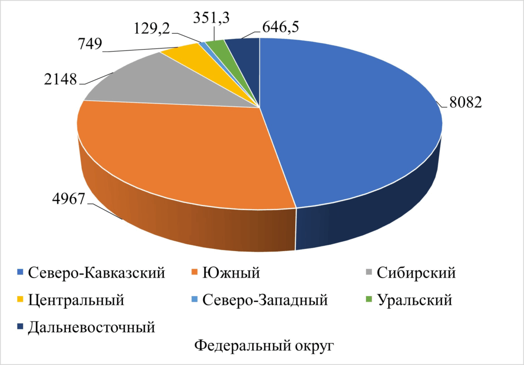 所有形態を問わず、羊の飼育頭数が最も多かったのは、北コーカサス(8,082,300頭)、南部(4,967,500頭)、シベリア(2,148,400頭)、ヴォルガ(2,005,800頭)、中央(749,000 頭)の各連邦管区であった。羊の飼育頭数の割合が最も低かったのは、北西部(129,200頭)、ウラル(351,300頭)、極東(646,500頭)の各連邦管区であった(図1)。