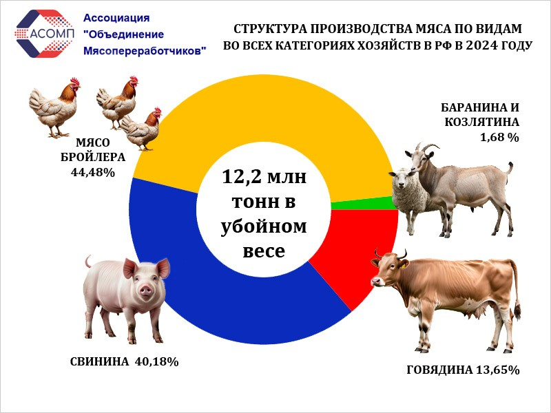 В 2024 году Россия достигла рекорда по производству и потреблению мяса. Поголовье КРС снизилось до 16,38 млн голов. Стат...