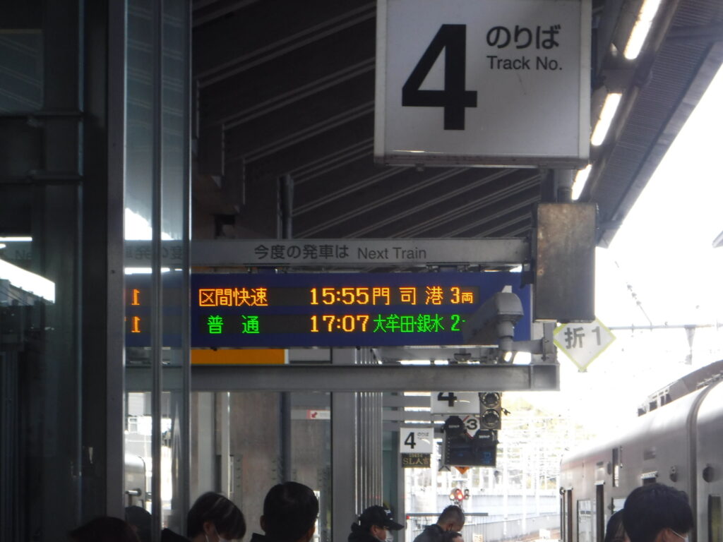 鹿児島本線博多方面の電車を確認すると、15:55発の区間快速門司港行きを発見。「おや、門司港まで1本で行く上に、しかも快速だぞ」と喜び、これに飛び乗りました。