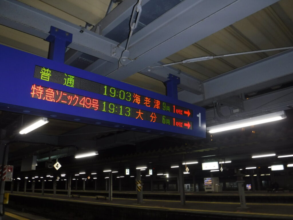 そして、特急の「大分行」や、普通の「海老津行」(←どこかわかんない駅)という表示が、さらに電車初心者の僕を惑わせます。鹿児島本線を通る電車なのになんで大分に行くんだよ・・・。