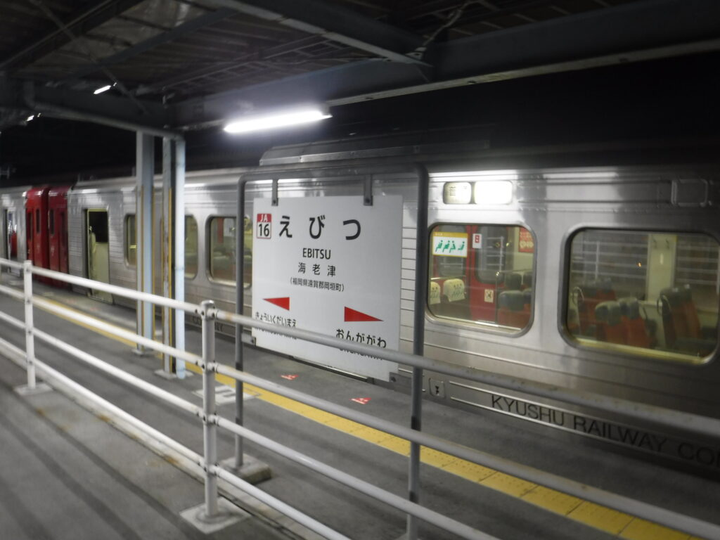 もうなるべく早く先に行くしかないと思って、半ば自暴自棄になりつつ、よくわからない次の「海老津」行に乗りました。後から考えれば、海老津に快速が止まらない可能性もあるわけで、結構危ない賭けでしたね。ここでおとなしく快速を待ち続けたらよかった。