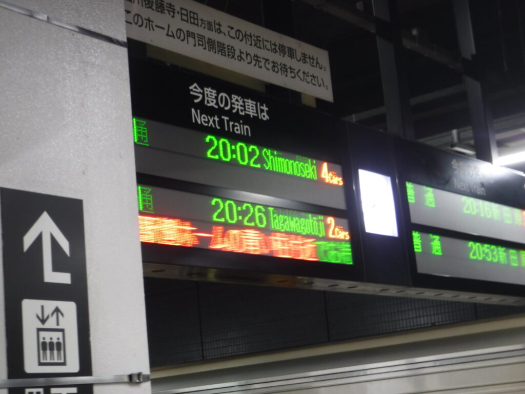 そこからあとは予定通りです。19:59小倉で下車、20:02下関行(小倉始発)に乗ります。