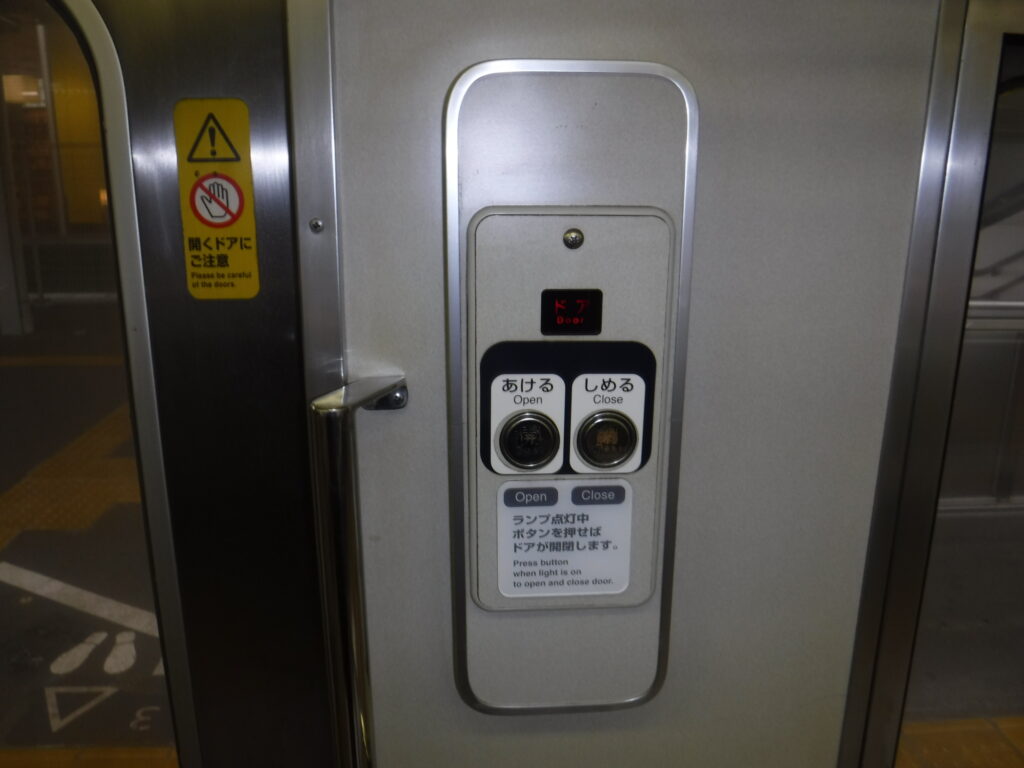 暖房の節約や、寒気の流入を防ぐため、駅で長時間停車するときなどはドアは閉まった状態になり、必要に応じてボタンで開閉するという仕組みみたいです。なんで鹿児島にはないんだろう。