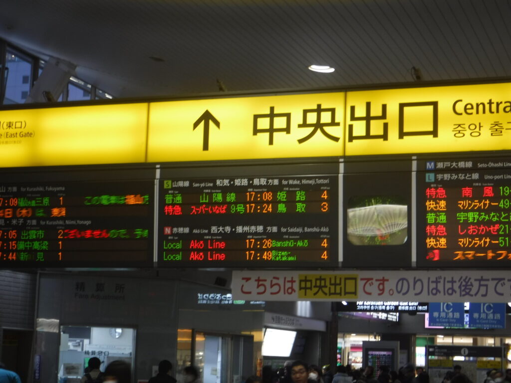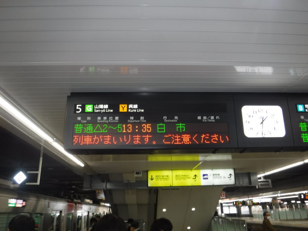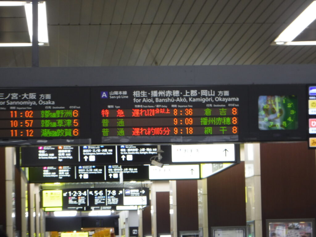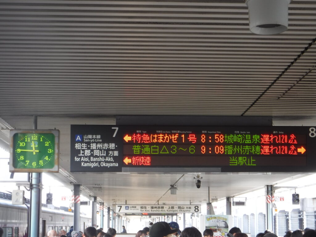 徐々に、山陰方面に向かう特急(スーパーはくと等)が再開していき、11:50ごろ、遅れ120分以上となった09:09発の播州赤穂行きに乗車(※姫路からは全て山陽本線)。電光掲示板の遅れ表示が地獄。