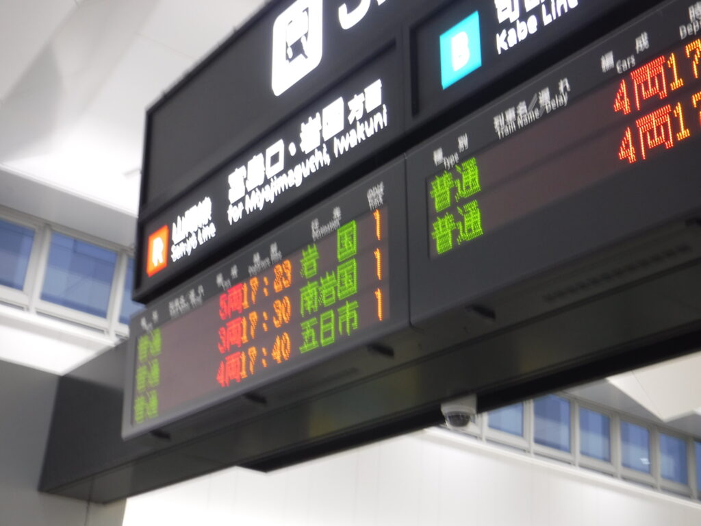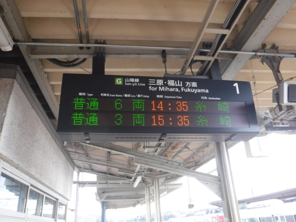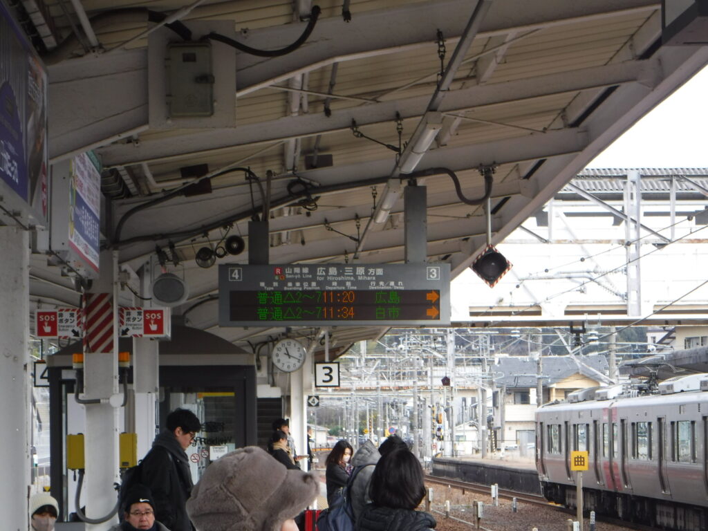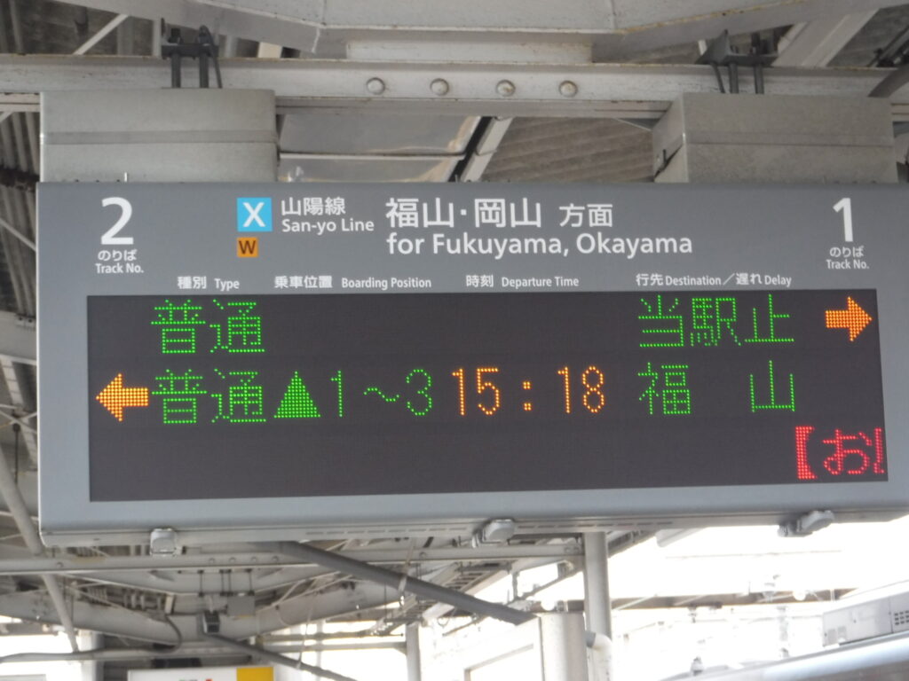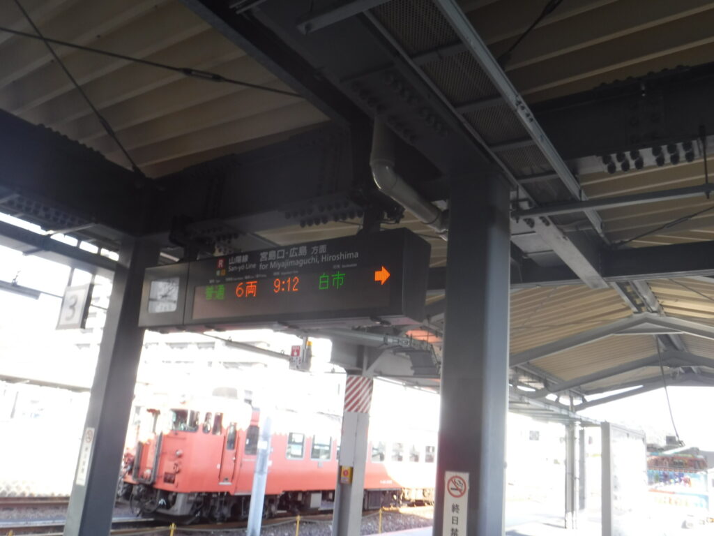 徐々に、山陰方面に向かう特急(スーパーはくと等)が再開していき、11:50ごろ、遅れ120分以上となった09:09発の播州赤穂行きに乗車(※姫路からは全て山陽本線)。電光掲示板の遅れ表示が地獄。
