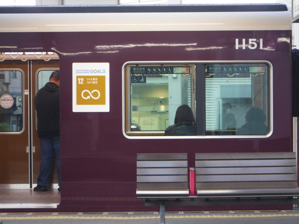 (26日に撮影した写真ですが)阪急電車は上写真のような茶色の電車で、SDGsトレインというイマドキのラッピング車両も走っていました。