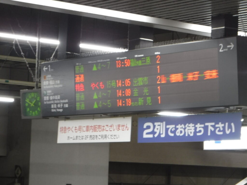 11時ごろになって戻ってきて、大阪方面は再開してましたが、岡山方面はようやくスケジュールが立ったところ。しかも、電光掲示板を見る限り、次発は特急倉吉(鳥取県)行き、次次発は普通網干(姫路のわずか2駅先)行きということで、岡山駅に繋がる電車はさらに先になりそうな感じ。