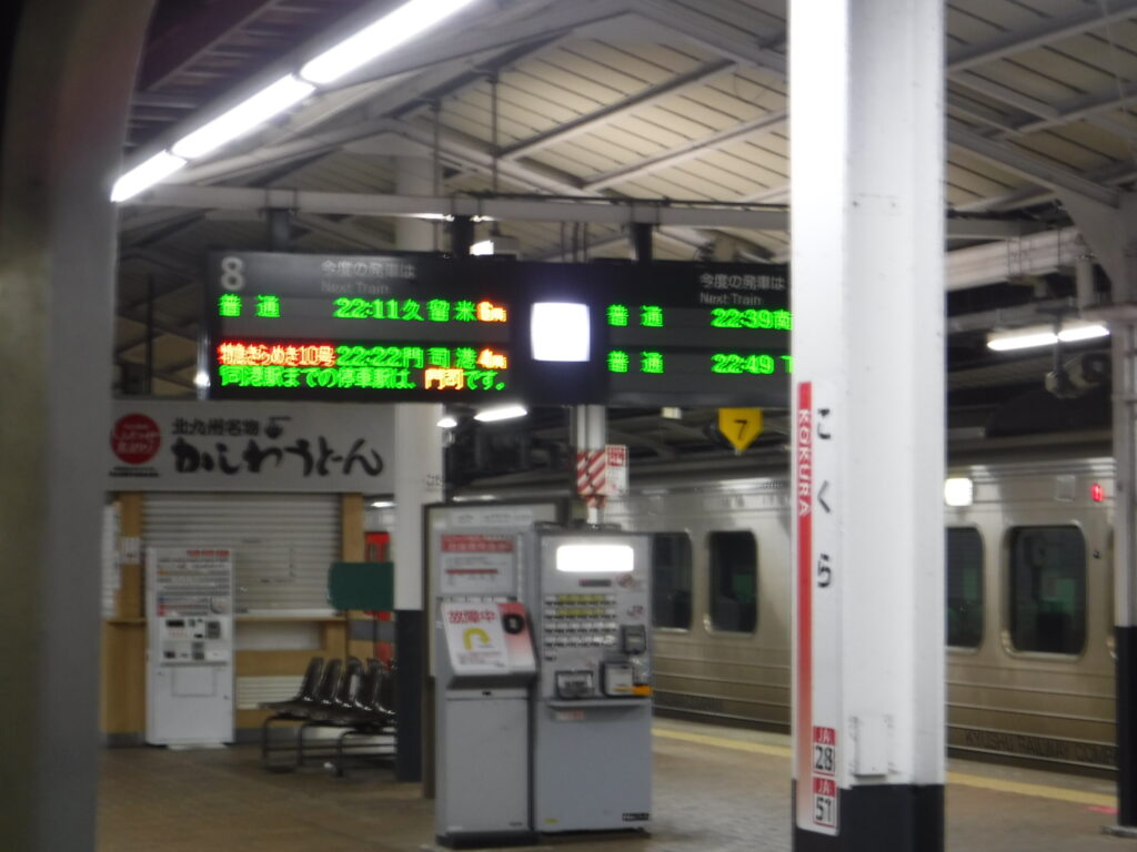 22:11小倉発の久留米行きです。博多に行く最後から2番目の電車です。終電は22:39南福岡行きです。