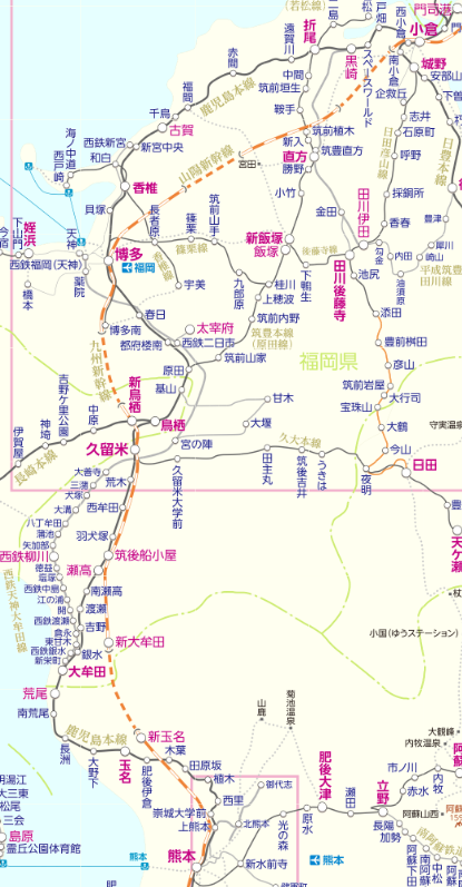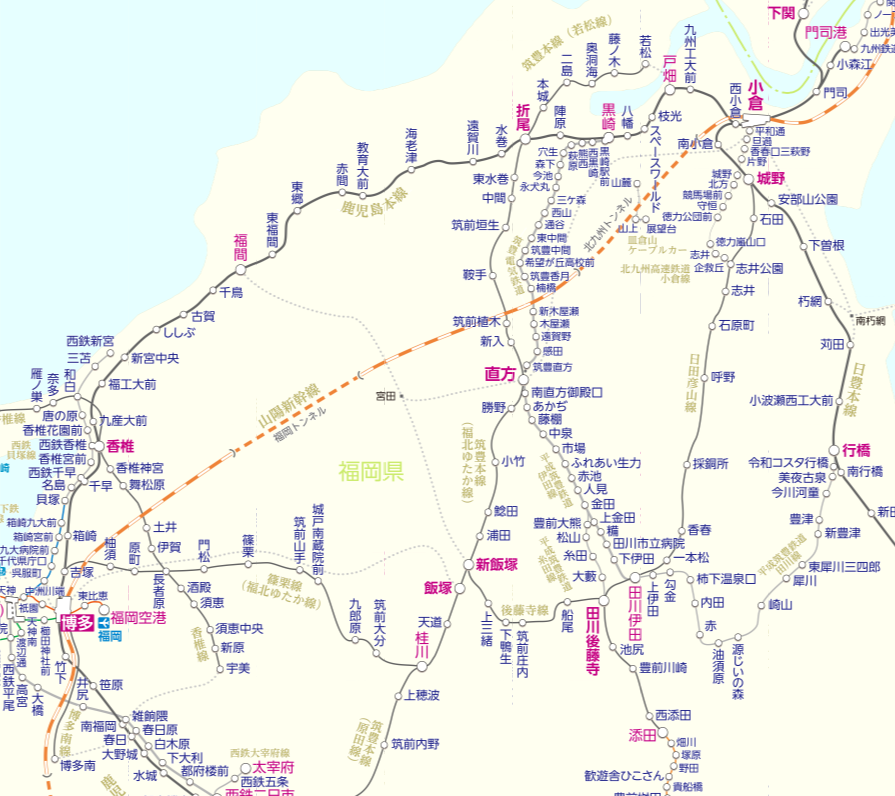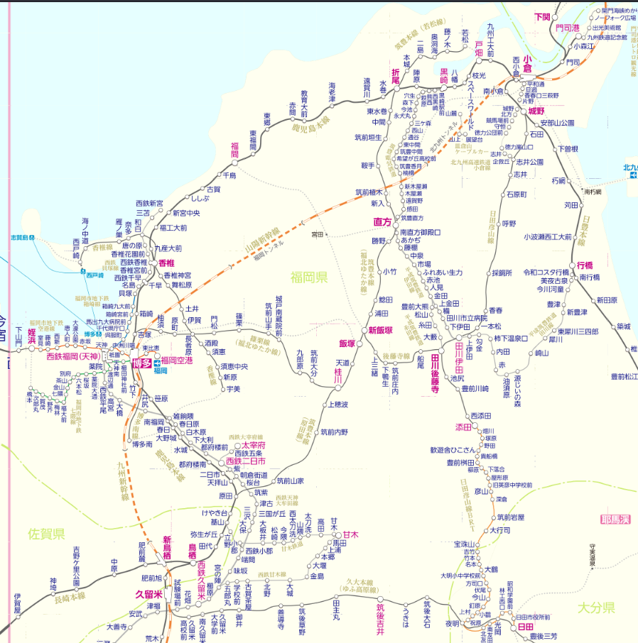 本当は、久留米~門司港の快速に乗るはずでした。車内の路線図を見てびっくり。快速の区間が全然違うのです。