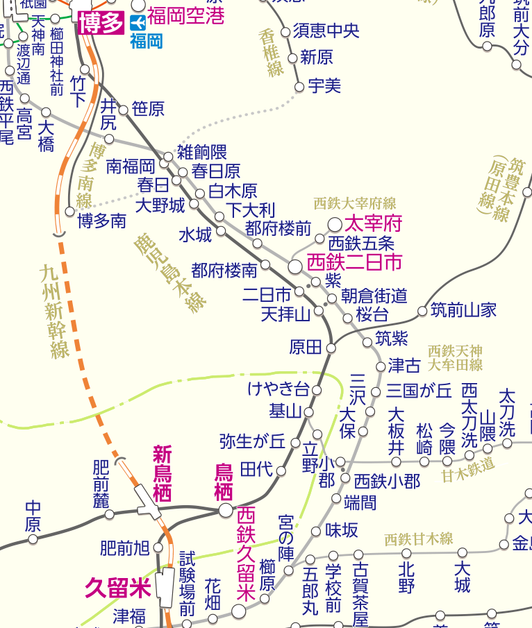 仕方ありません。西鉄の終電が終わってないことに望みをかけて、地下鉄空港線の終電に飛び乗り、天神へ向かいます(天神には西鉄の駅があるので)。