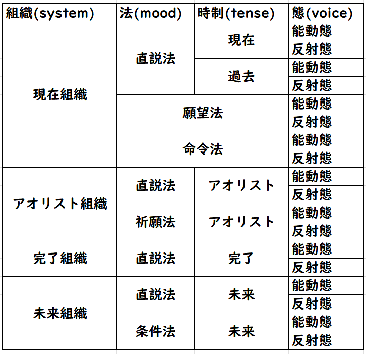 サンスクリット語の動詞の体系は下表のようになる(受動態など、派生的な動詞は除く)。