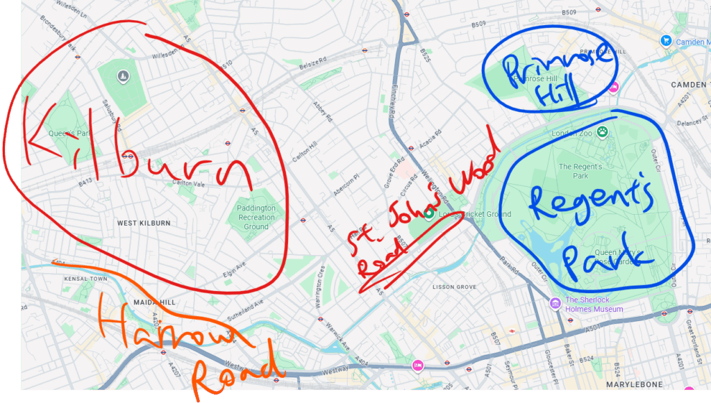 London (about me) gazed at me spectrally*. The windows (in the white houses) were (like the eye sockets of skulls). (About me) my imagination found a thousand noiseless enemies moving. Terror seized me, a horror of my temerity*. (In front of me) the road became pitchy black 【as though it was tarred*】, // and I saw a contorted* shape lying across the pathway. I could not bring myself to go on. I turned (down St. John’s Wood Road), and ran headlong (from this unendurable stillness) (towards Kilburn). I hid (from the night and the silence), 《until long after midnight》, (in a cabmen’s* shelter in Harrow Road). But (before the dawn) my courage returned, // and 【while the stars were still in the sky】 I turned once more (towards Regent’s Park). I missed my way (among the streets), and (presently) saw (down a long avenue), (in the half-light of the early dawn), the curve of Primrose Hill. On the summit, (towering up to the fading stars), was a third Martian, (erect and motionless like the others).
