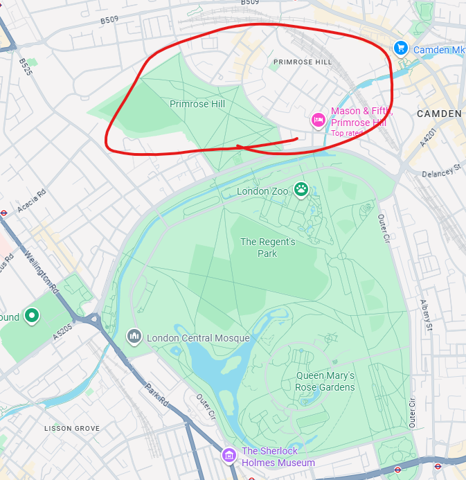(Across the pit on its farther lip*), (flat and vast and strange), lay the great flying-machine 〔with which they had been experimenting (upon our denser atmosphere) 【when decay and death arrested them】〕. Death had come (not a day too soon). (At the sound of a cawing* overhead) I looked up (at the huge fighting-machine 〔that would fight no more for ever〕), (at the tattered* red shreds* of flesh 〔that dripped down (upon the overturned seats) (on the summit of Primrose Hill)〕.