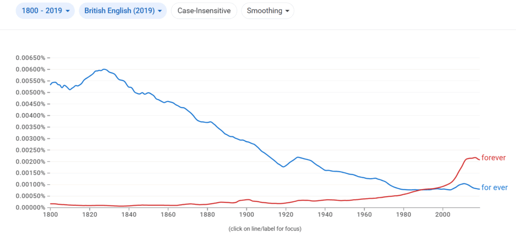 foreverはわりと最近使われるようになったみたいだな(下のNgram viewer。赤がforever、青がfor ever)