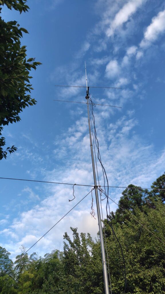 左)蒼穹に突き刺さるX7000(144/430/1200MHz帯アンテナ)とHB9CV(50MHz帯アンテナ)