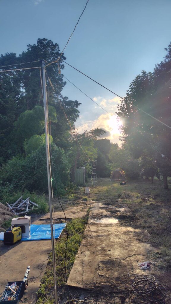 右)耀ける星へ架ける階(3.5MHz帯 ワイヤDPアンテナ)(40m超なのに余裕をもって設営できたよ!すごいね!)