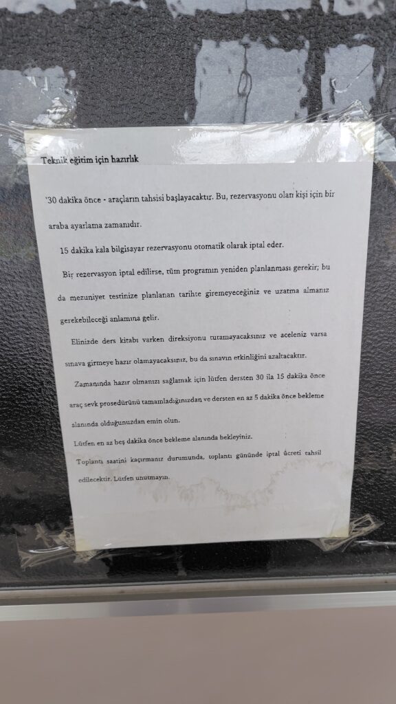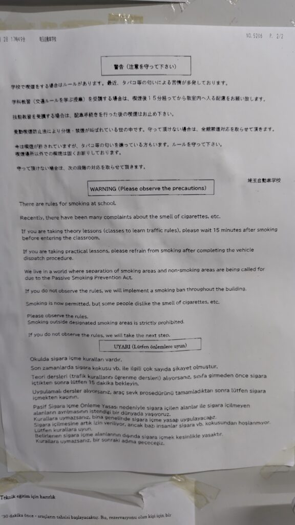 (いまどきはどこの免許合宿所でもそうなんでしょうけども)外国人の出稼ぎ労働者が免許を取りにやってくるため、このような多言語表記がされています(ここの合宿所ではトルコとパキスタンが多いみたいです)。わたしが合宿所にいた期間は、中国人が1人と、ミャンマー人が1人と、パキスタン人が4人ほど合宿していました。