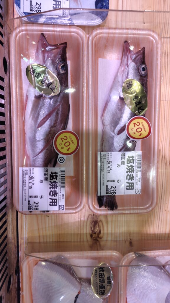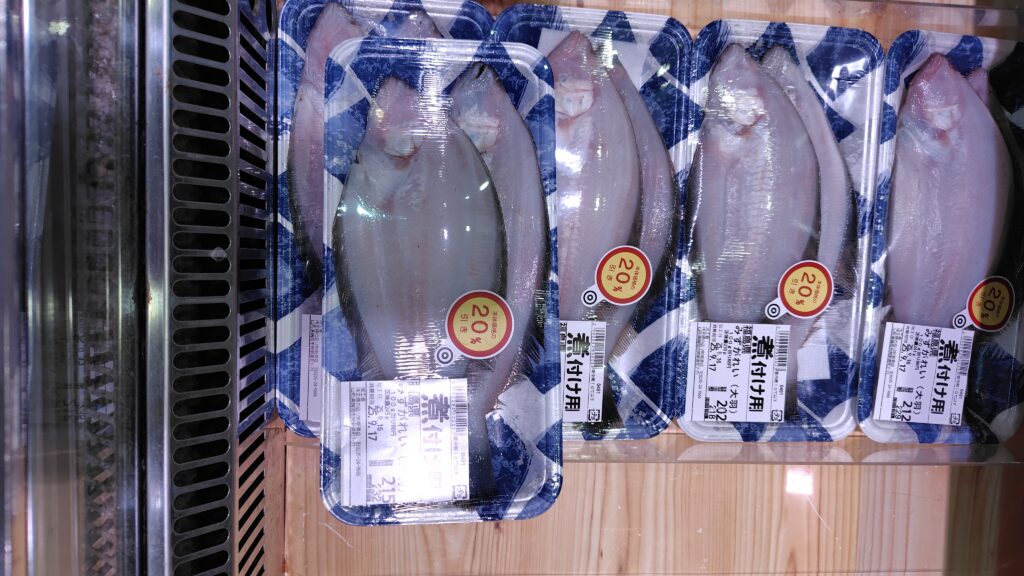 ↓スーパーのおさかなコーナー。左から、みずがれい;海ぶどう;あら です。