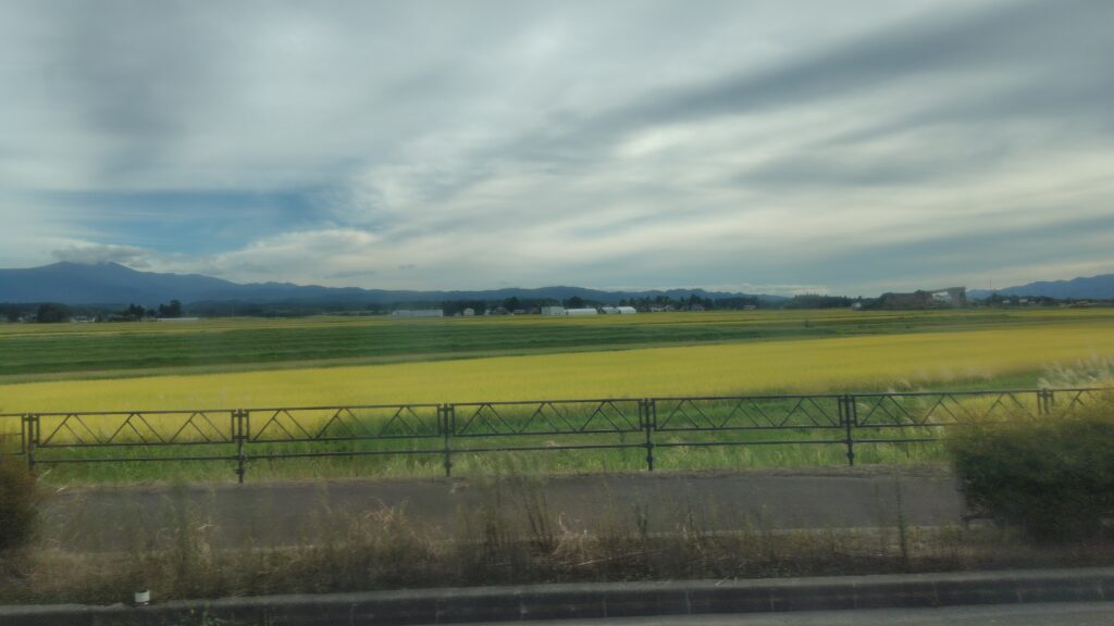 鶴岡駅付近から羽黒山登山口まで、バスで40分ほどでした。道中の田んぼには、庄内平野のコメがよく実っていました。