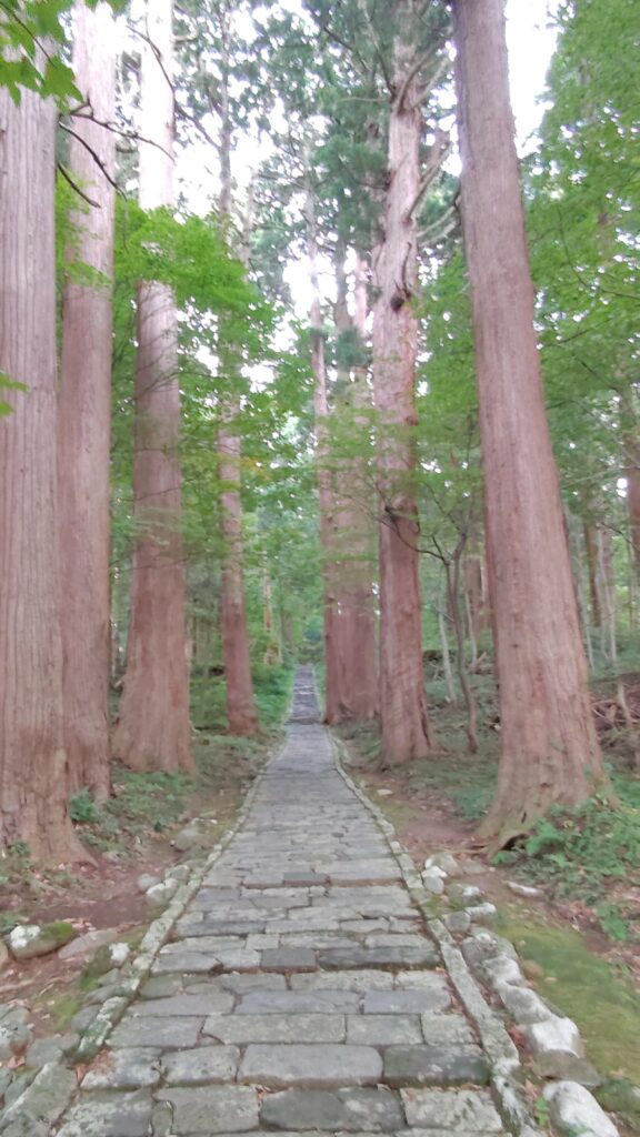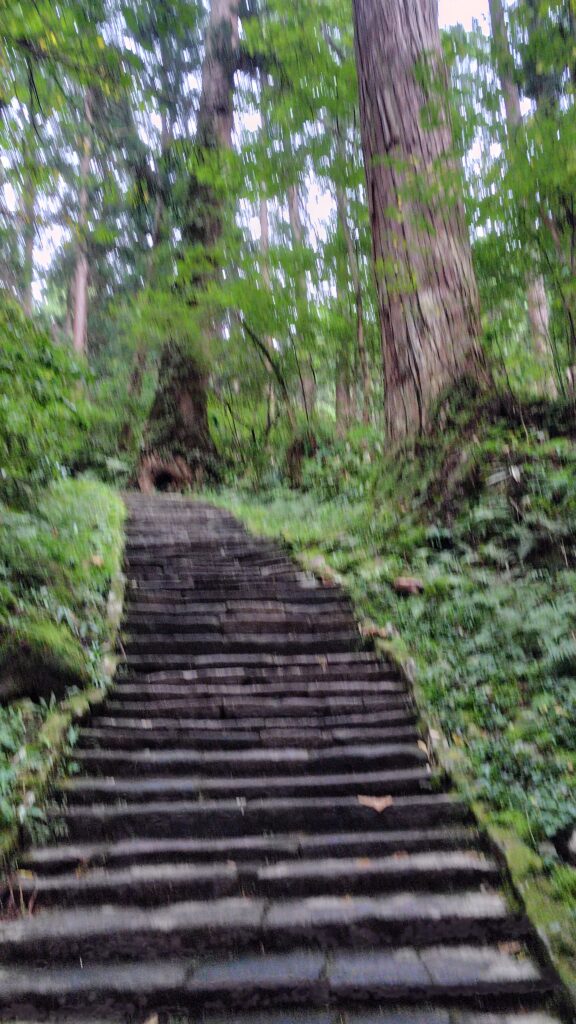 そこから1時間弱、針葉樹林の中に敷かれた石段をてくてく登っていきました(結構急な場所もありました)。