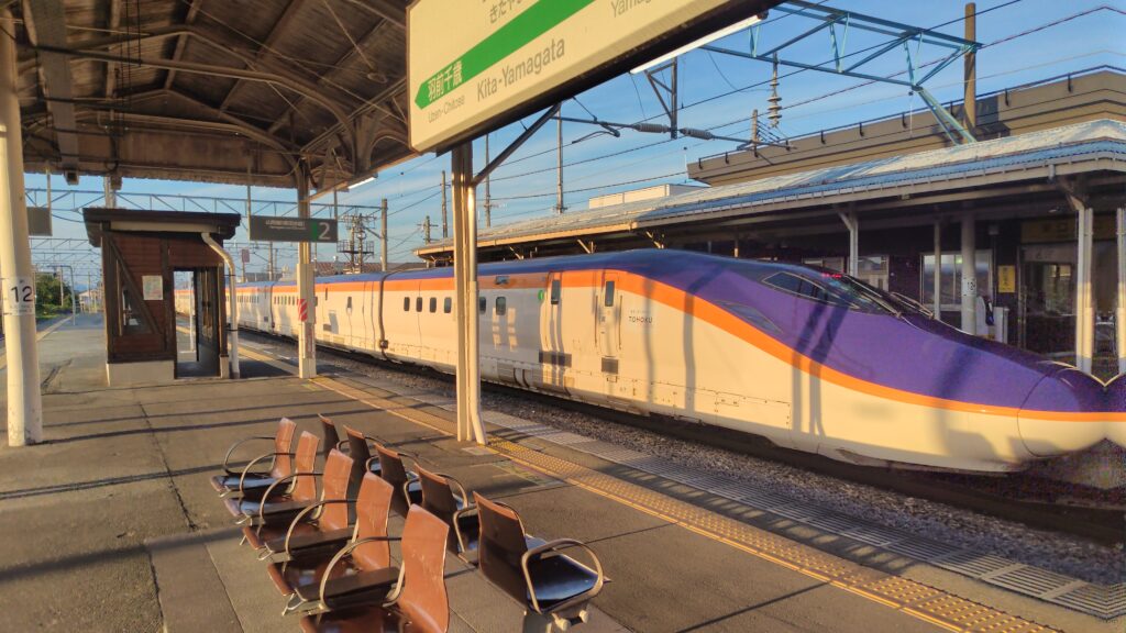 ↑右写真のように山形新幹線がふつうに在来線の線路を走っておりました(この新幹線の色使い好き)。