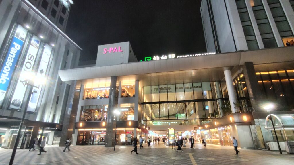 ↓なんやかんやで1930ごろに仙台駅に到着。仙台駅周辺は東京並みのガチ都会でびっくりしました。都会は人間(特に若者)の見た目が違いますよね。髪染めてる人とかピアスしてる人とか…。