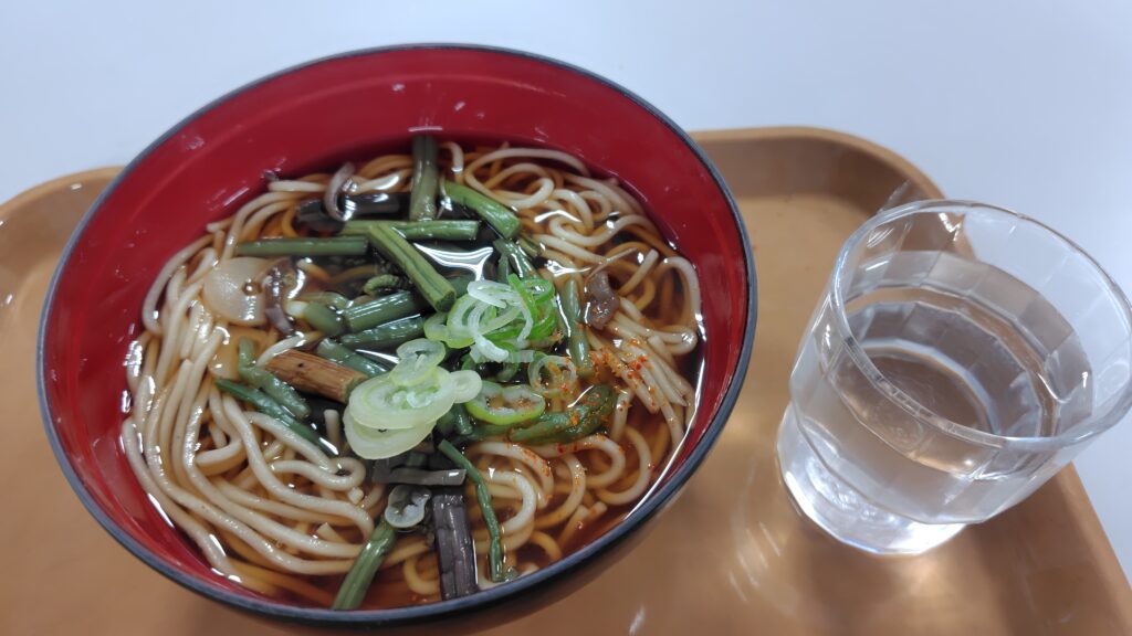 ↓北上駅西口のロータリー(左)/ 北上駅構内の蕎麦屋の山菜そば(右)