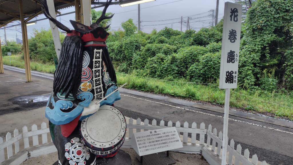 ↓花巻駅ホームにて。東北地方では鹿踊というのが各地でみられるようです。