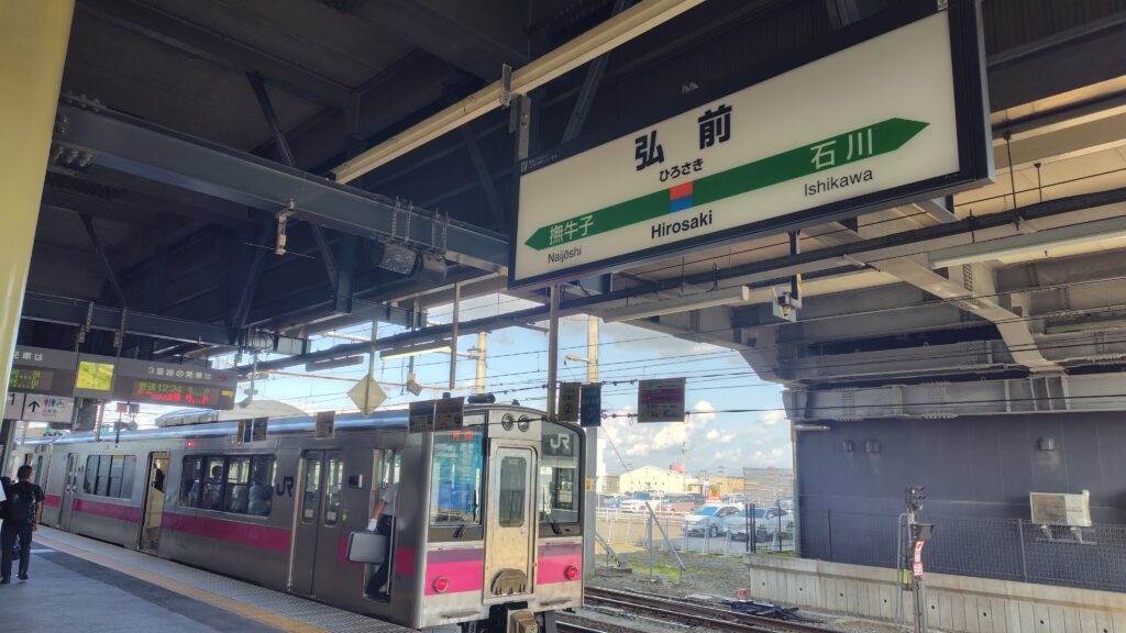 約1時間ほどで弘前駅に到着(左写真)。かわいらしい列車も見えました(右写真)。案内表示を見る限り、弘南鉄道っていう路線なのかな?