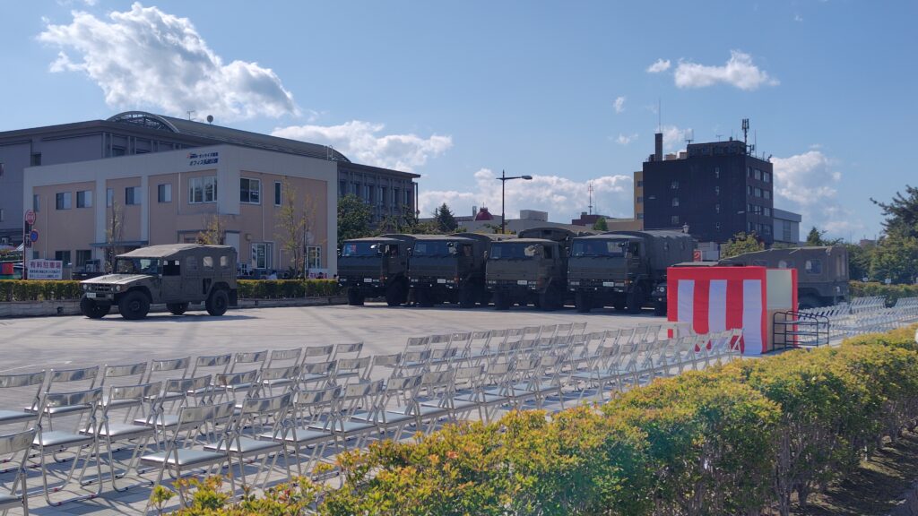 ↓陸自の車両が広場に集まっていました。どうやらパレードの前日だったようです。