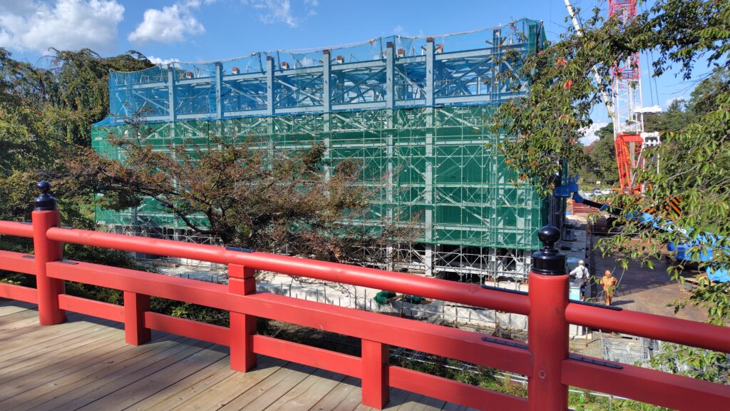 ↓工事中、天守は土台から切り離され、数十メートル離れたところに移設されていました。櫓かなってくらい小さくてかわいい天守ですね。
