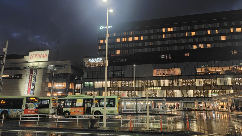 駅前商店街を散歩した後、アスパム青森(↑)という商業施設でお土産を買う頃には、もう19時近く。そろそろ、東京に向かう高速バスが出発する時間です(先ほどの電車内で予約していました)。