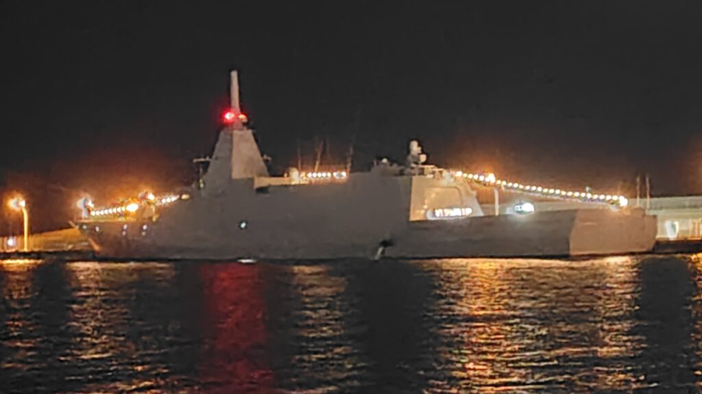 こんな風に夜景をとっていると、上写真の奥に光るオレンジ色の明かりの列に違和感を覚えました。雨が降る暗闇の中でしたが、一瞬、護衛艦の姿が見えたような気がしたのです。