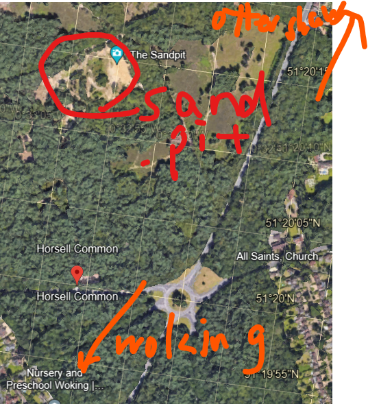 本文中の「sand-pit」は共有地の中にある砂地だ。しっかりGoogle Earthにも載ってるな。