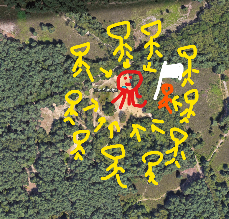 そして代表団が火星人に向かって前進するにしたがって、まわりの人々(下画像黄色)も穴の方に前進してるってわけ。