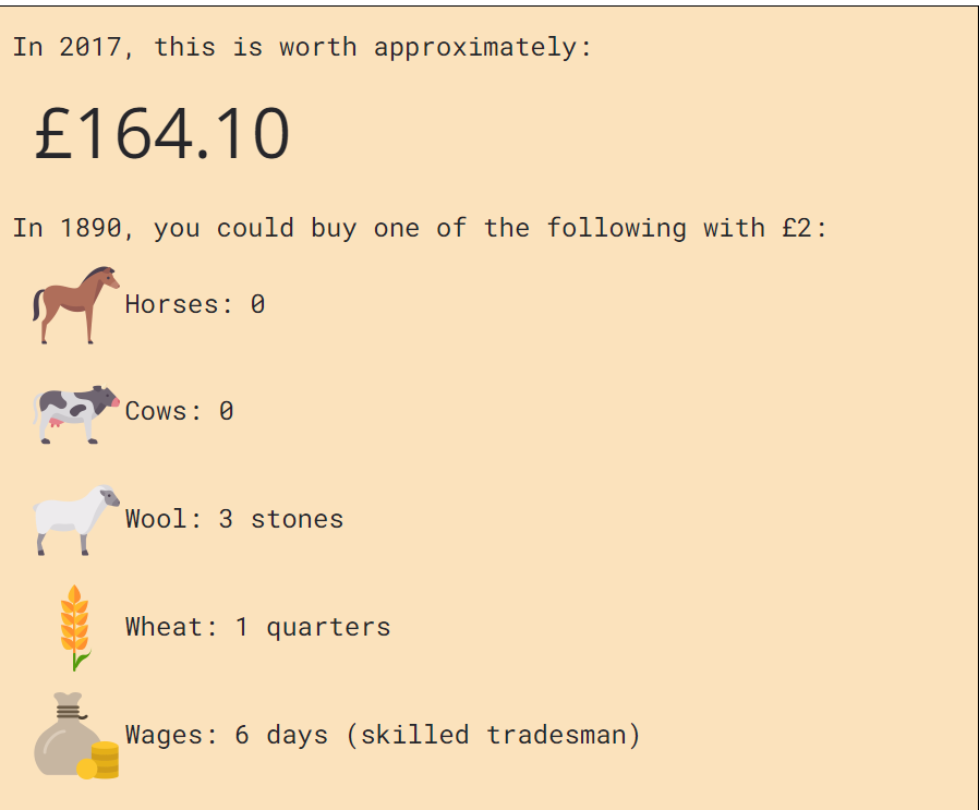 結果は以下の画像。2017年の価値で164.10ポンドね。これは2017年の日本円(1ポンド≒145円)に直すと24000円程度。