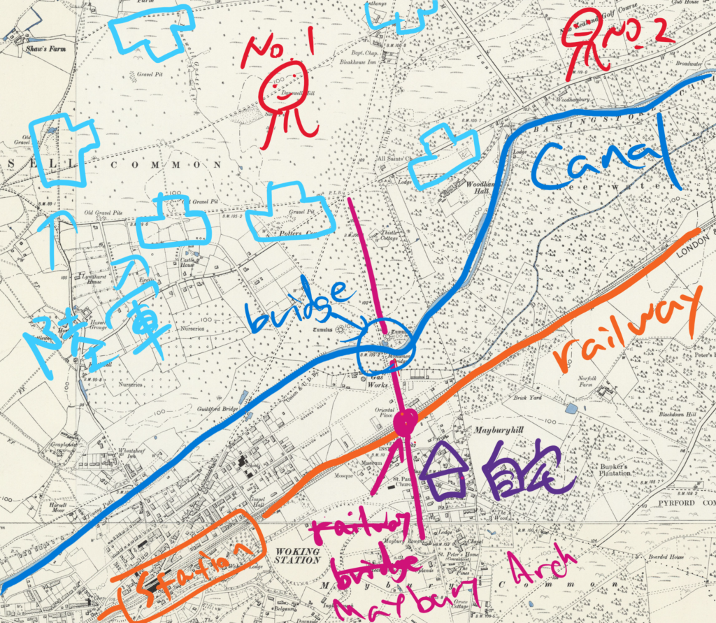 リッちゃんの自宅から火星人のいるHorsell Commonに伸びる道路(赤紫色のペン)は、途中で鉄道(オレンジのペン)、運河(青のペン)と交差するんだよ!
