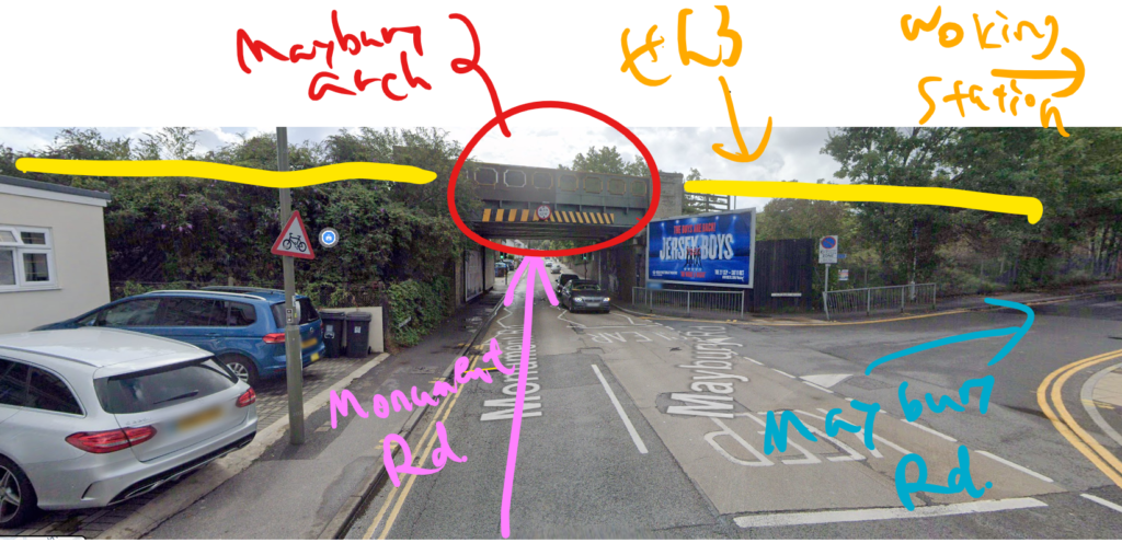 鉄道と交差するところが「railway bridge」(またはMaybury arch)だね。第90話も参照してほしいんだけど、線路と道路が立体交差してるの。だから「bridge」って言われてるんだよ!