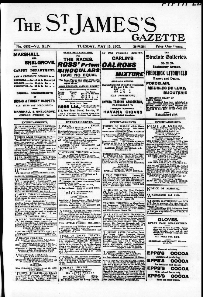 「St. James’s Gazette」は1880~1905年にかけて発行されていた、(日曜を除く)日刊の夕刊紙よ。以下は1902/05/13のものね。