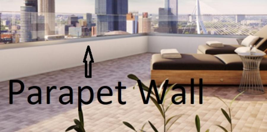 parapet wallよ。橋なら「欄干」って言うけど、この場合はこんな風に屋上に設置された転落防止の壁のことね。
