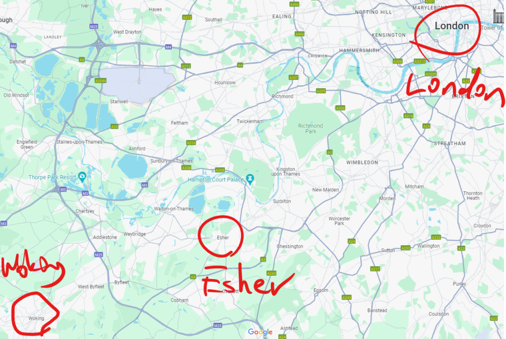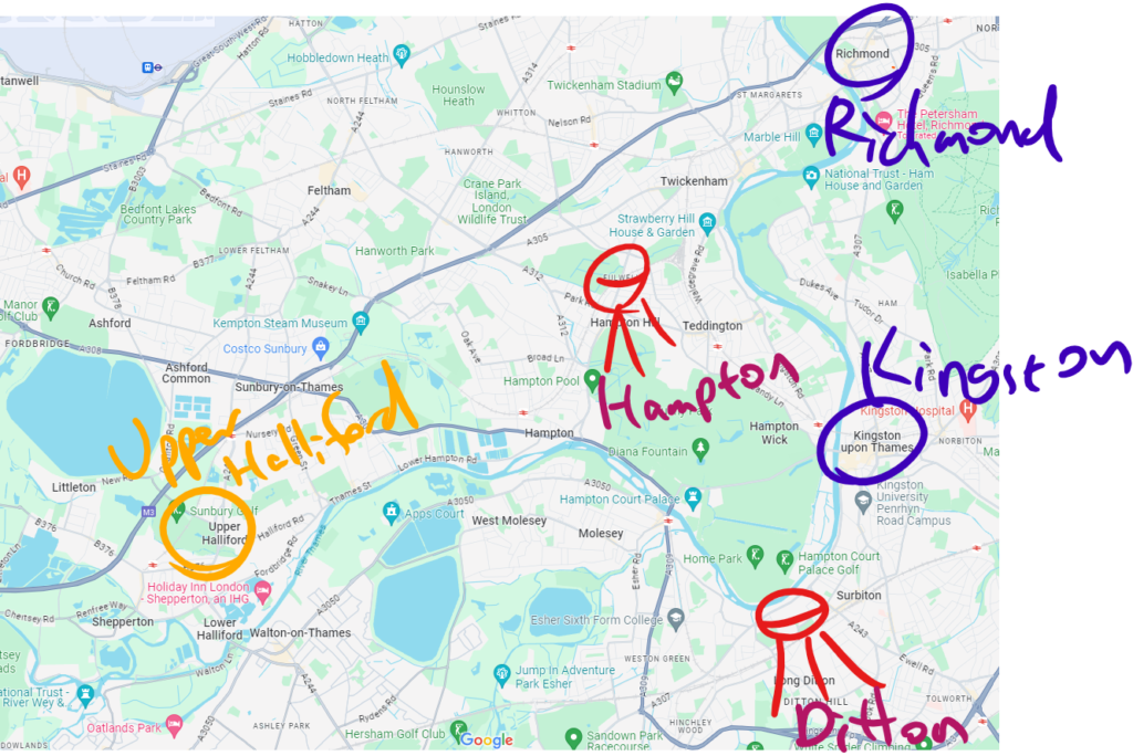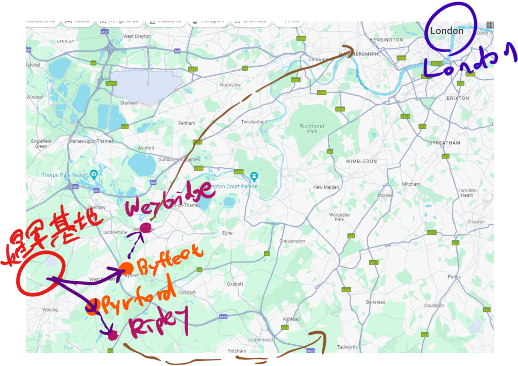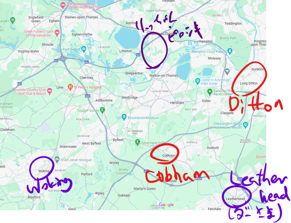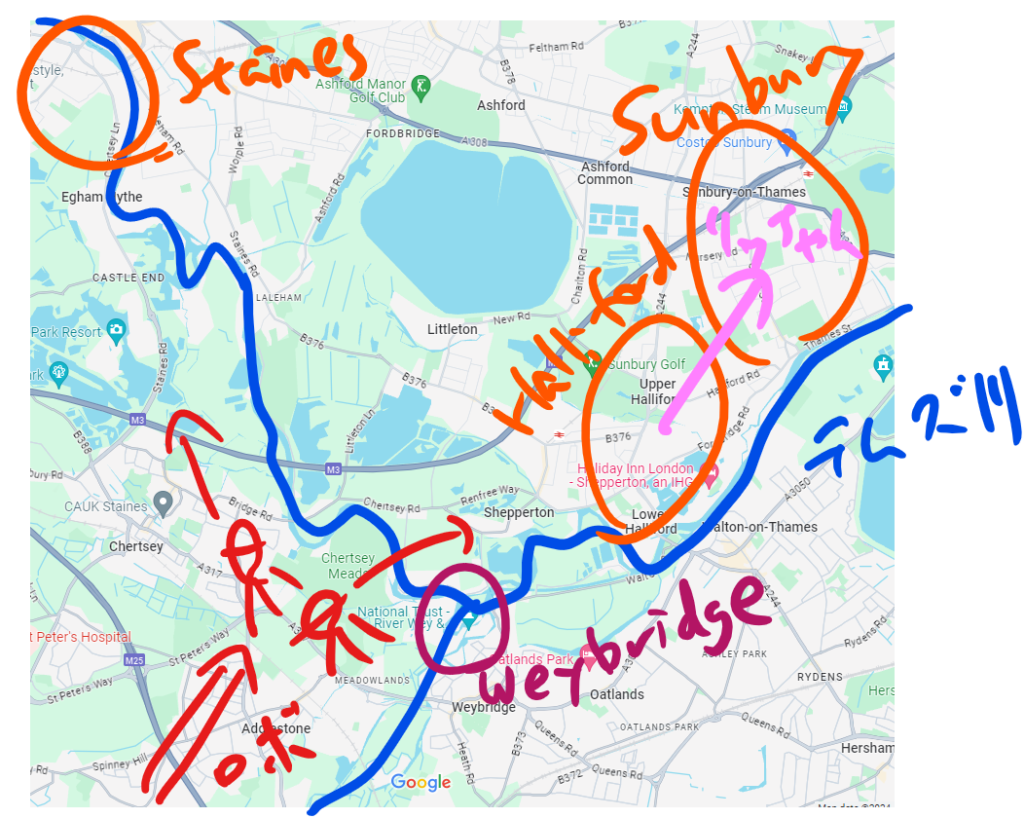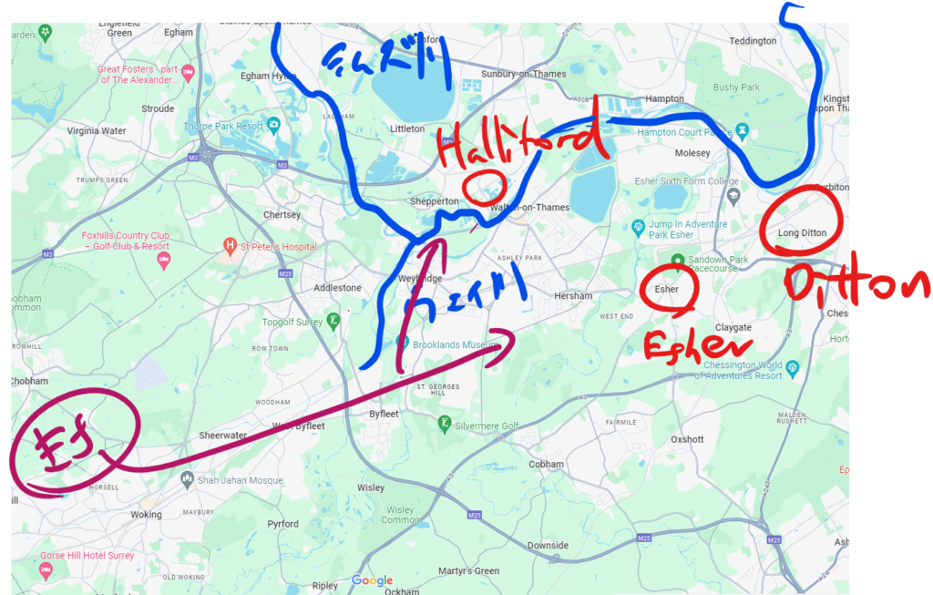 Hallifordのあたりよ。Weybridgeから逃げて来たんだったわね。
