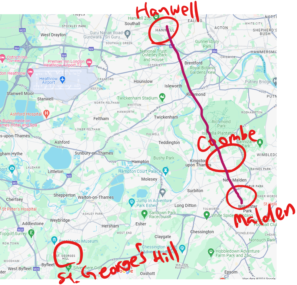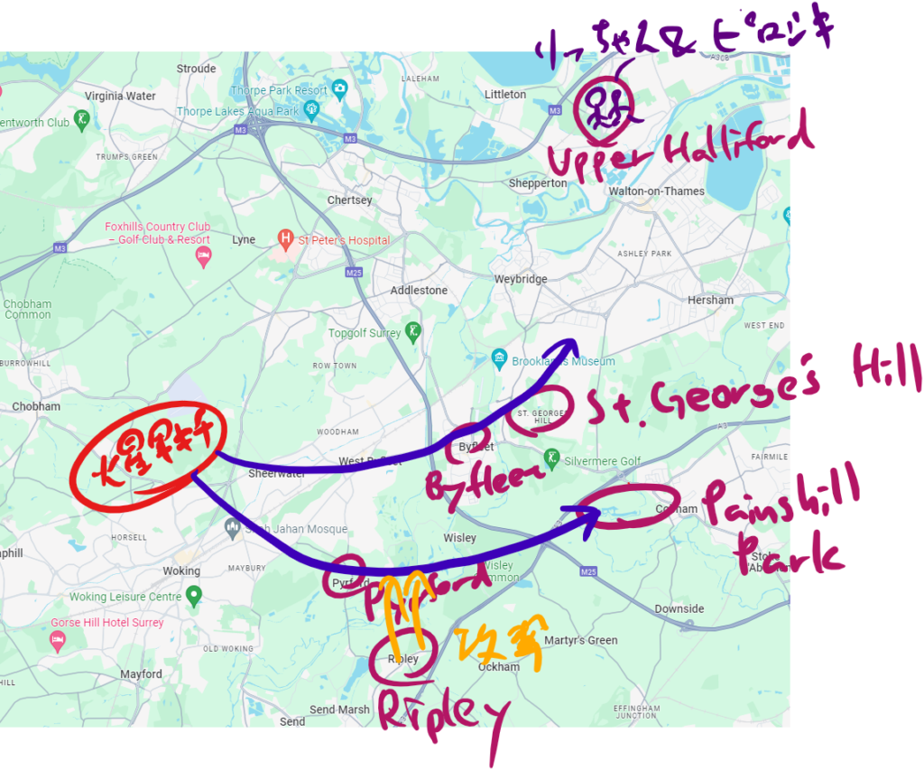 St. George’s Hill(標高78m)を中心として1000ヤードの円を描いた地図よ。900m強だからね。