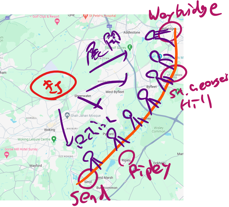 Byfleet and Pyrford towards Ripley and Weybridge