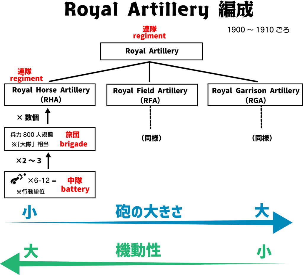 ここら辺の部隊単位はややこしくて頭が痛くなるけど、砲兵はRA > RHA/RFA/RGA > 旅団(≒大隊)> 中隊 という階層構造を理解してもらえればOK。だいたい戦場では「中隊」が行動単位となるわ。