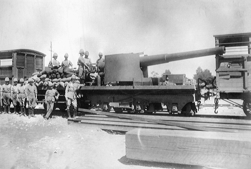 第2次ボーア戦争では、以下の写真のように、普通に車輪をつけて巨砲にしたり、列車に乗せて列車砲にしたり。