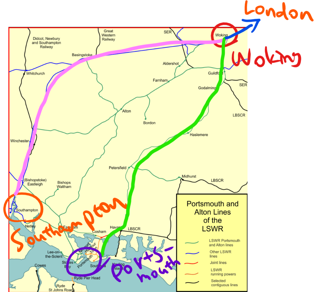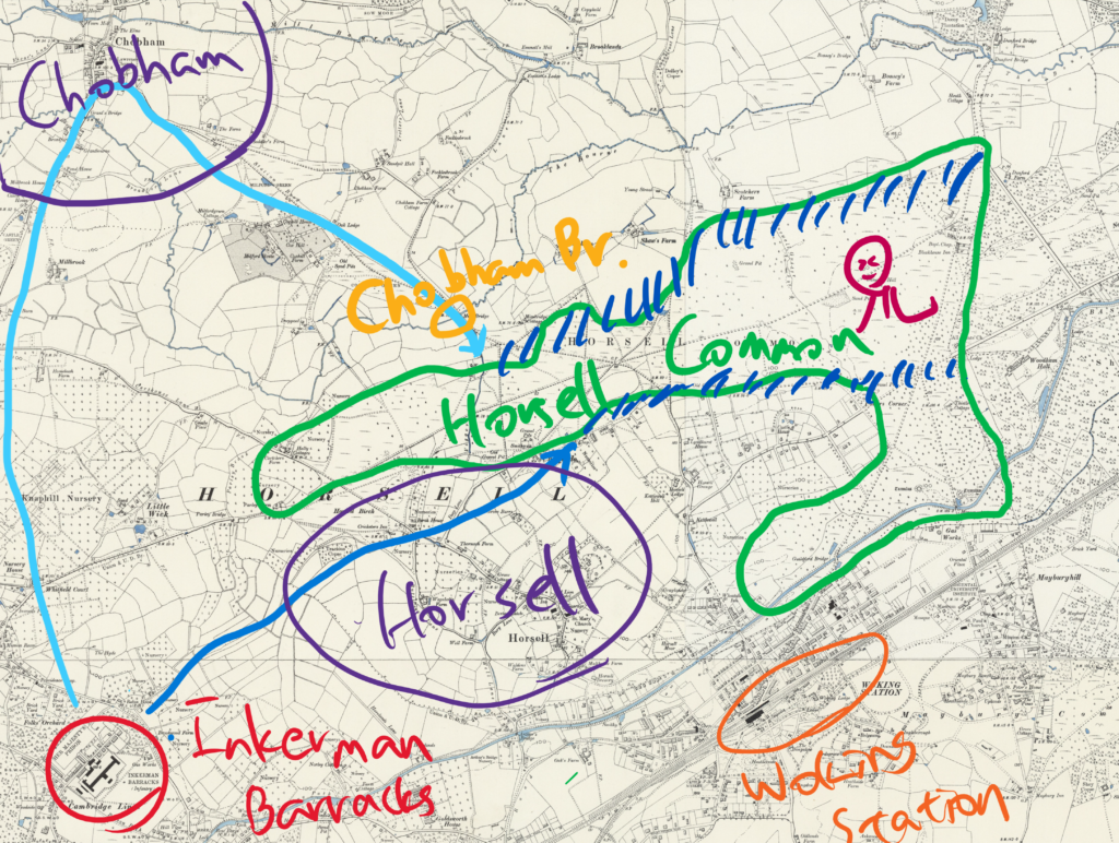 ④インカーマン兵営(Inkerman Barracks)(赤ペン):のちほどまた詳細に述べるけど、ここから最初に兵隊が出るの。1個中隊(青ペン)は普通にHorsellを行進して共有地南側に布陣、もう1個の中隊(水色ペン)(連隊の大佐がいるからこっちが本隊よね)はChobhamで行進してから共有地北側に布陣して、共有地を囲むのよ。