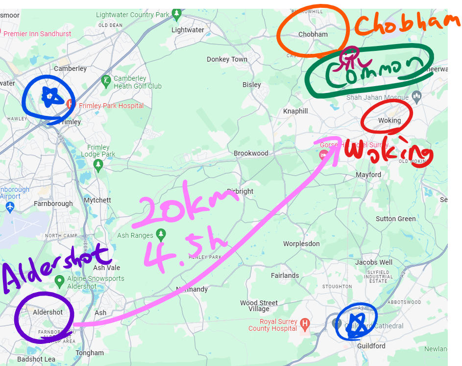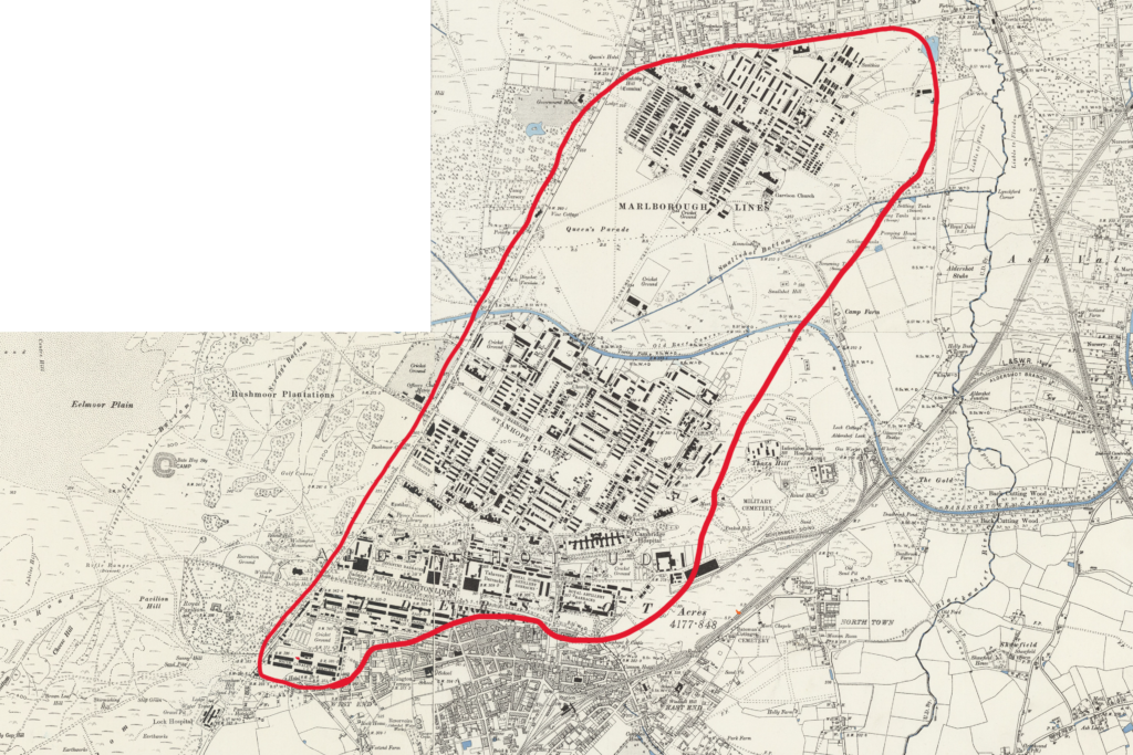 以下のAldershotの地図を見てわかるとおり、相当大きい基地(赤枠内)があるんだよね。