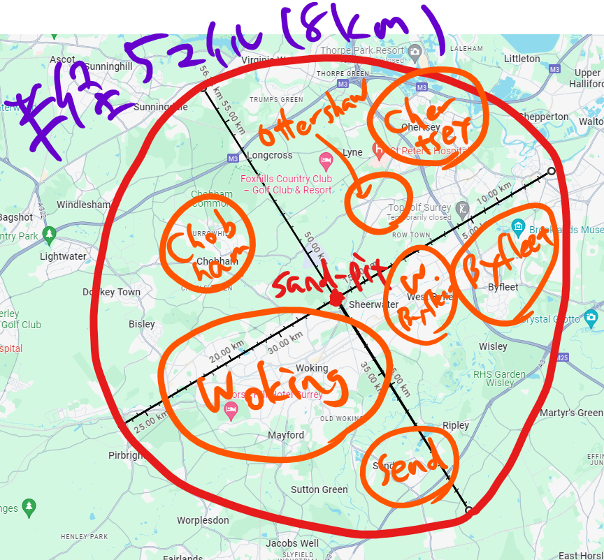 ともあれ、この円は火星人を見に来た人たちの出身地の、Chobham・Ottershaw・Chertsey・Wokingがちょうどぴったり入るサイズ。円周は16㎞×3.14≒50.24㎞だから、一周35㎞の山手線よりも広い範囲ということになるわ。