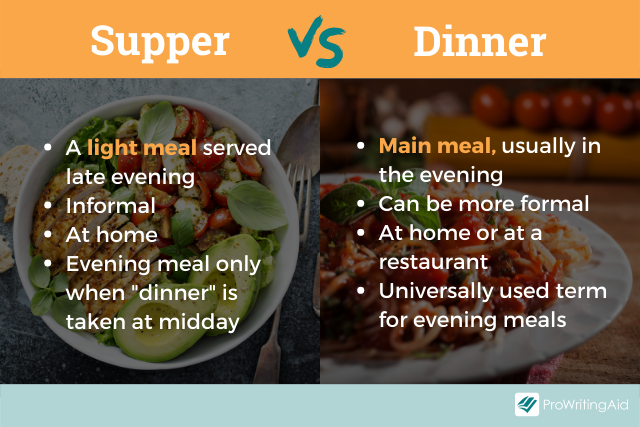 「supper」と「dinner」はどちらも「夕食」と訳していいんだけど、以下の画像のような違いがあるわ。supperは軽めで、dinnerはちゃんとしたものっていうのが主な違いだけどね。