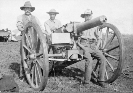 1885年くらいにイギリスで実用化された最新鋭の重機関銃。反動を利用して弾を装填するという革新的な銃で、毎分500~600発の銃弾を撃てたの。